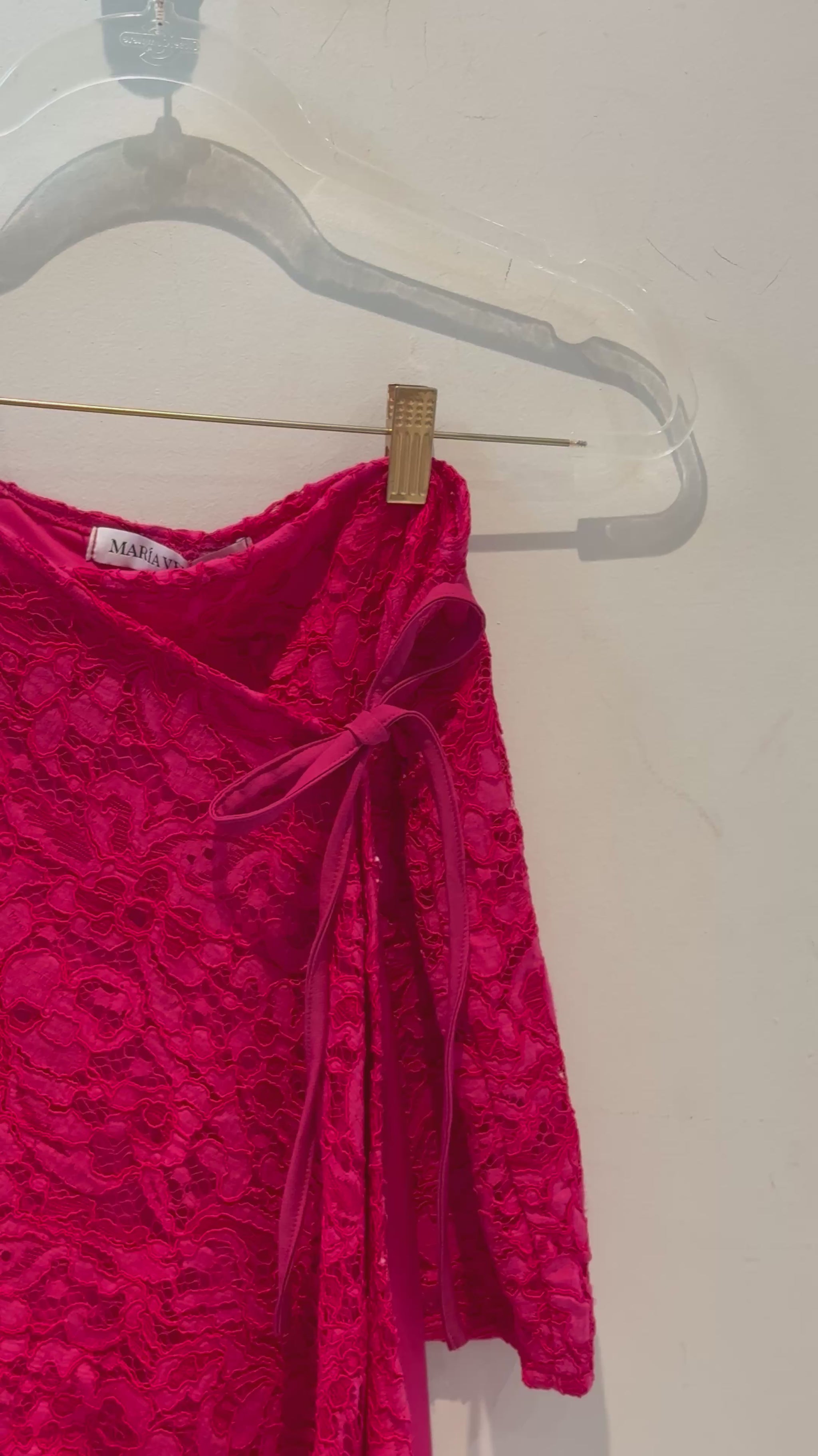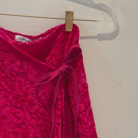 Falda corta asimétrica de encaje en color fucsia. Se amarra por dentro dando la posibilidad de ajustarla y cuenta con unos listones por la parte de afuera para cerrarla.