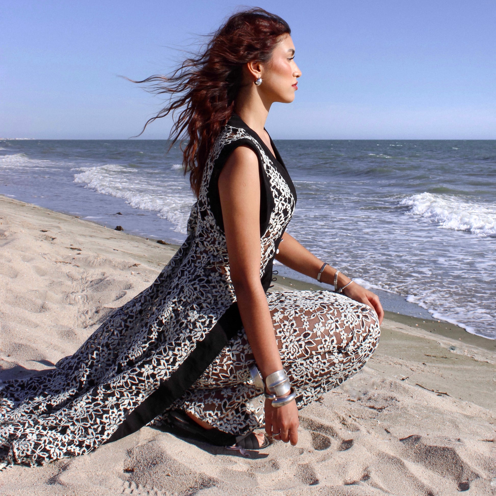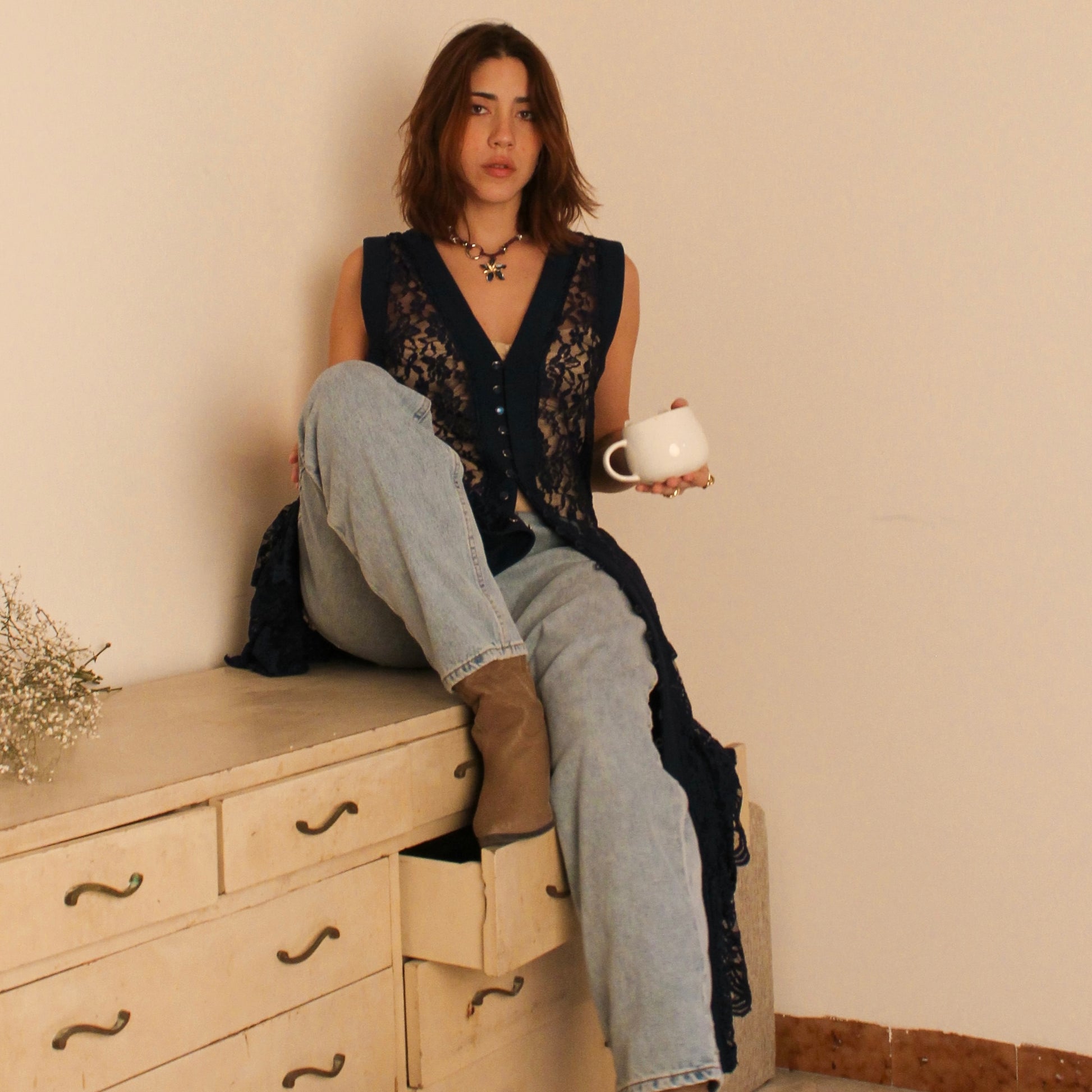 Una pieza que envuelve con sutileza y carácter. Este kimono está confeccionado en encaje, con un volante amplio en el bajo que aporta movimiento y un aire etéreo al caminar, mientras que las vistas en el frente y las mangas enmarcan la silueta con estructura y definición.
