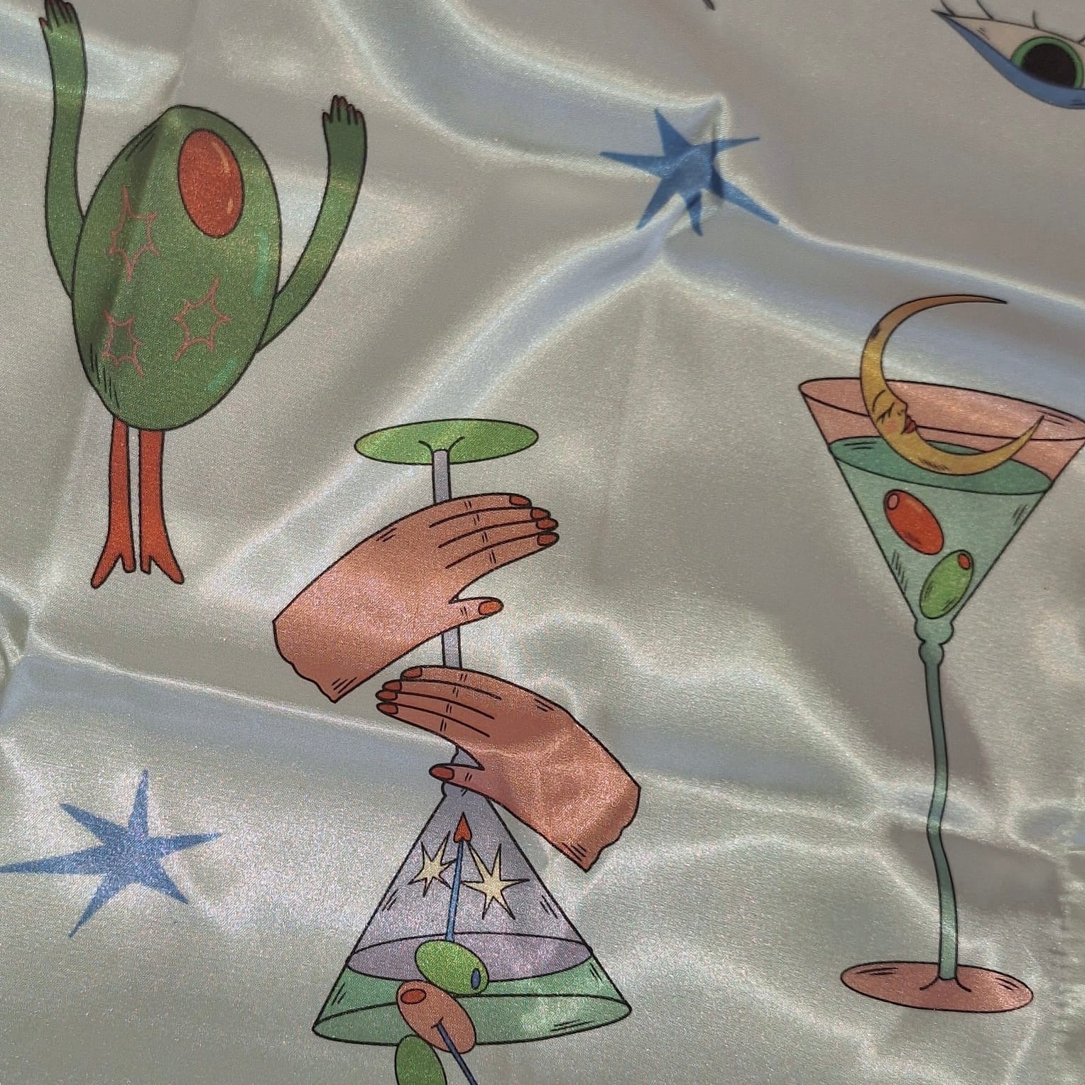 Mascada de satín color beige, con diseño de martinis, aceitunas y estrellas.