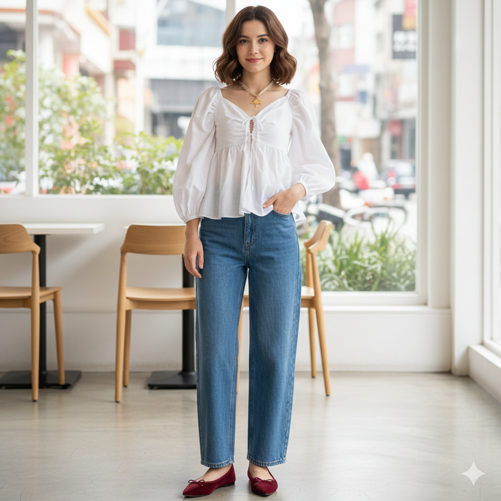 Top tipo campesina en color blanco, con escote en forma de corazón con tirantes en el centro, y mangas bombachas con elástico.