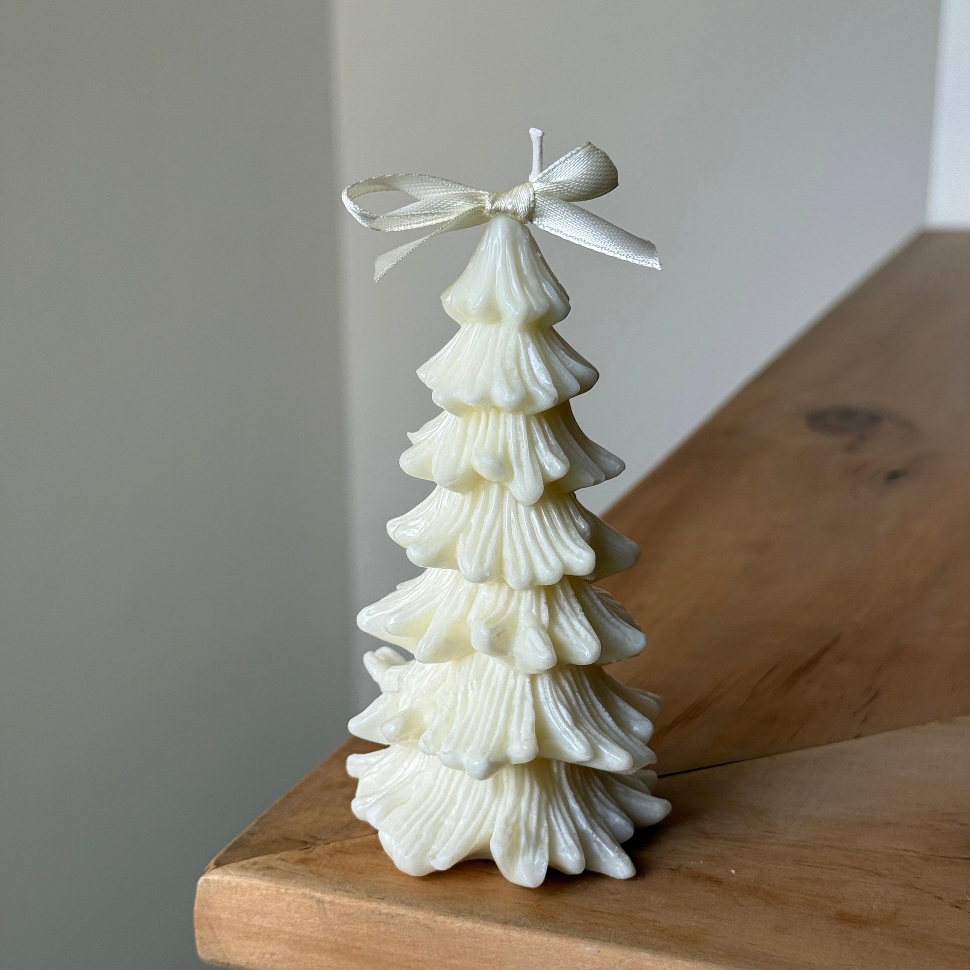 Vela navideña en forma de pino con follaje en forma de picos blanco.