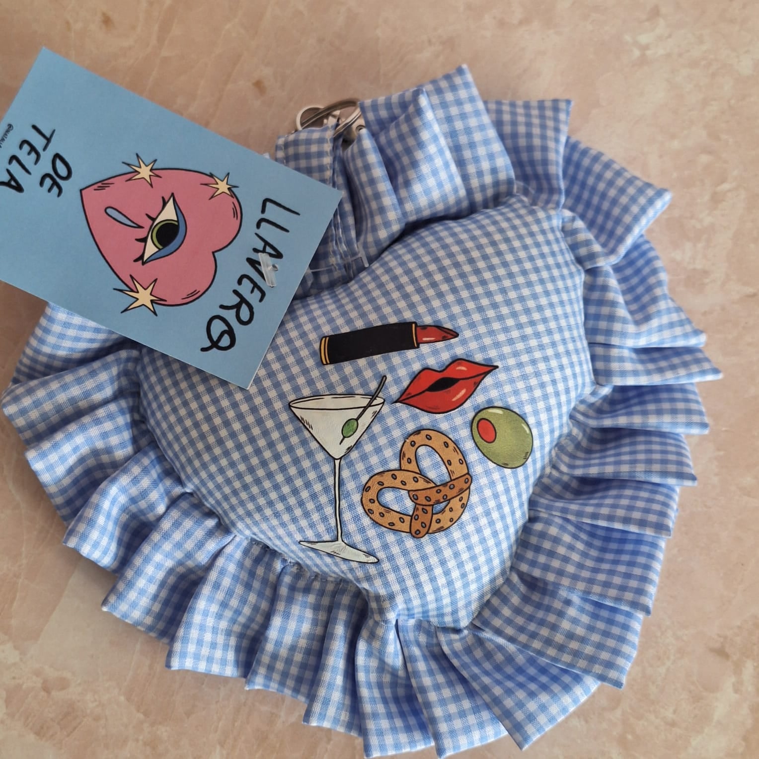 Llavero en forma de corazón color rosa o azul con la frase “todo lo bueno llega a mí”.
