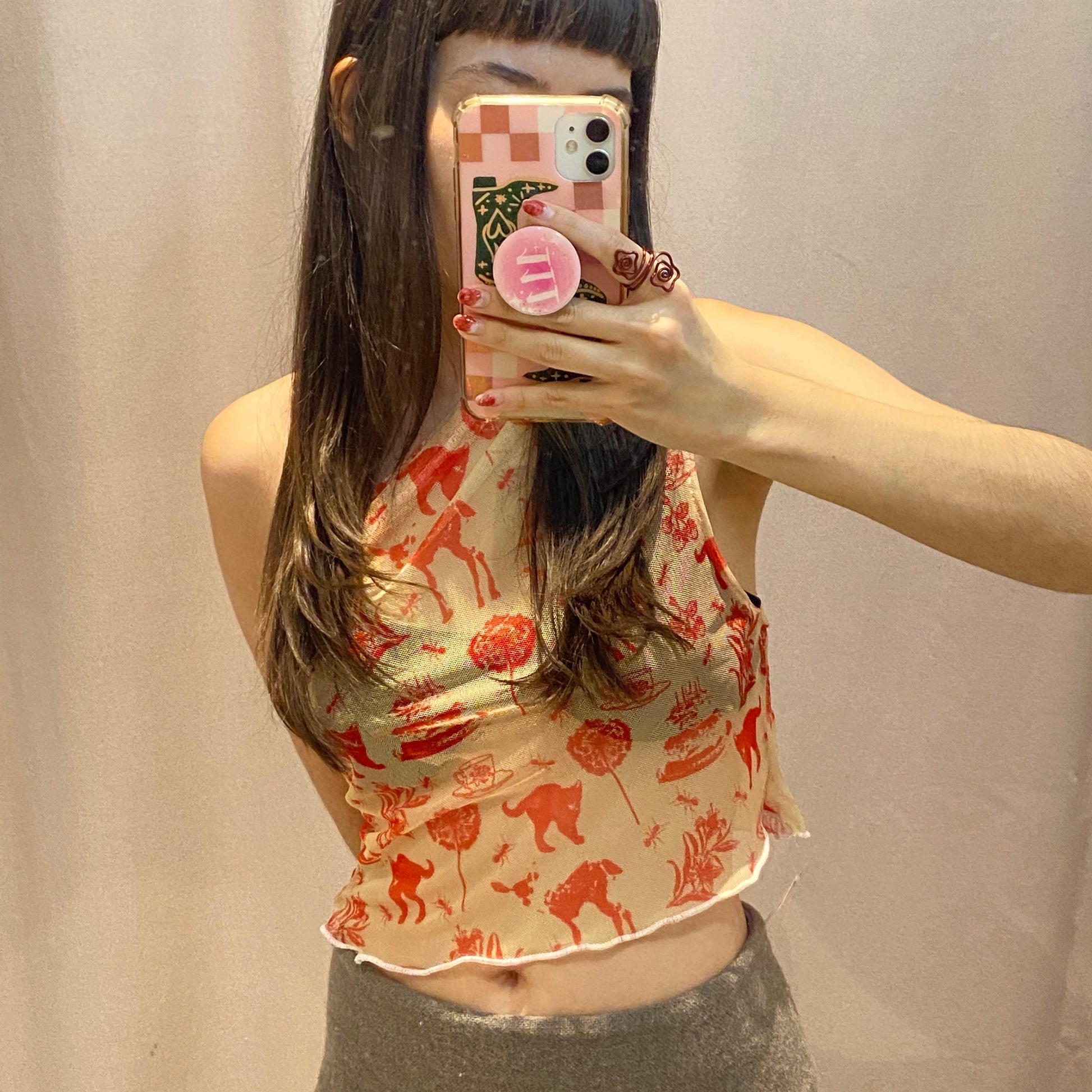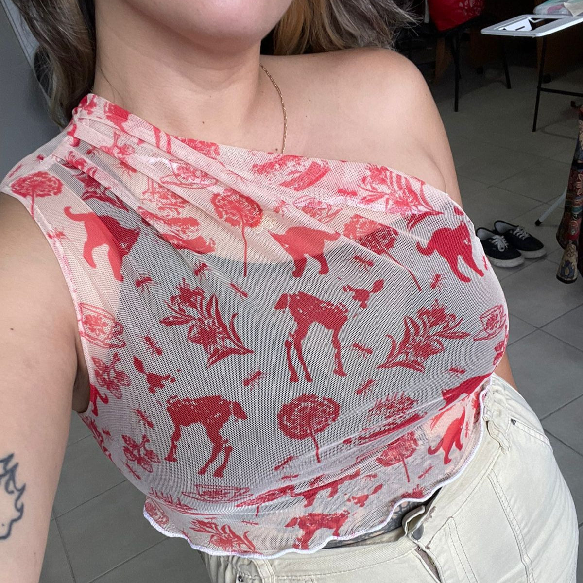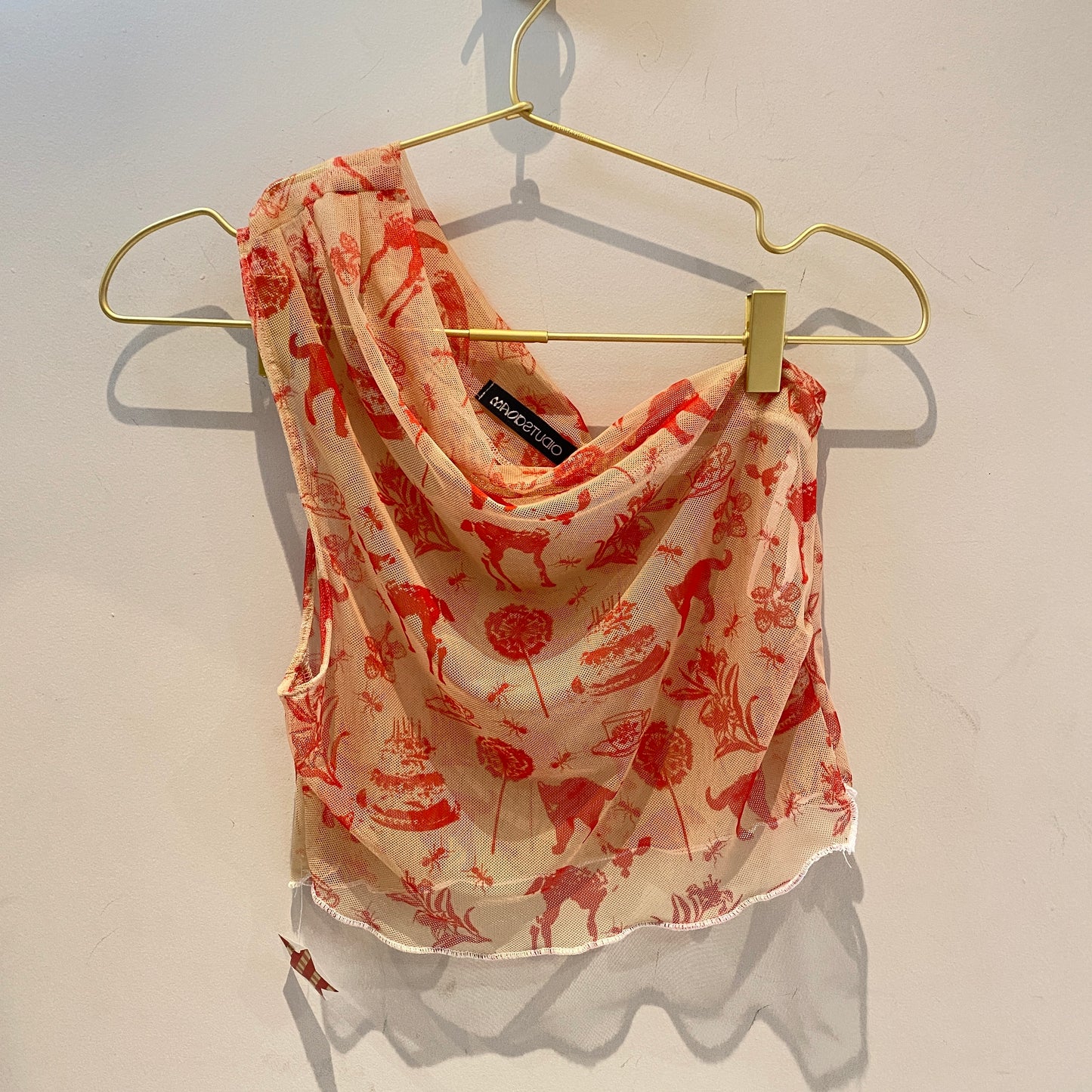 Top de un solo hombro en tela mesh con print de objetos rojos original de la marca.